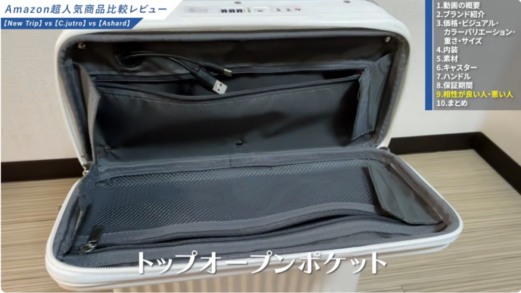 スーツケースの外側にポケットがついていて、本体を開けずにパソコンとか、化粧ポーチとかすぐ取り出せるし、充電もバッテリーをいちいちポケットからださなくてもケースのUSB充電口からできる、機能が優れて便利です。