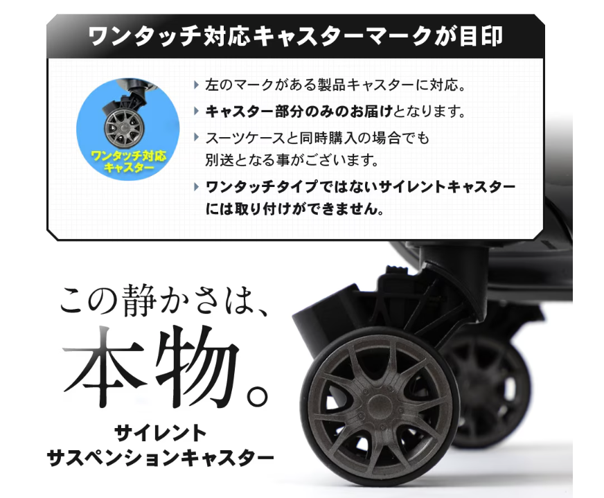 「自分でキャスター交換ができる」ことを前提に購入を検討している場合は、お目当てのモデルの商品ページで「ワンタッチ交換対応」の記載があるかを必ず確認してください。