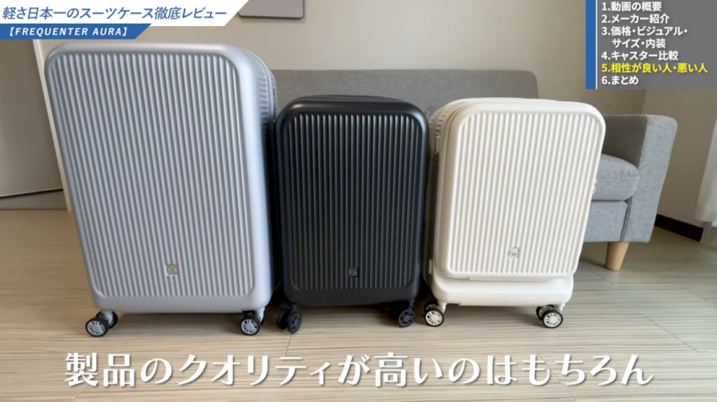 なお、僕のYouTubeチャンネル「スーツケース研究所」では、実物のスーツケースを触りながら詳しくレビューしています。