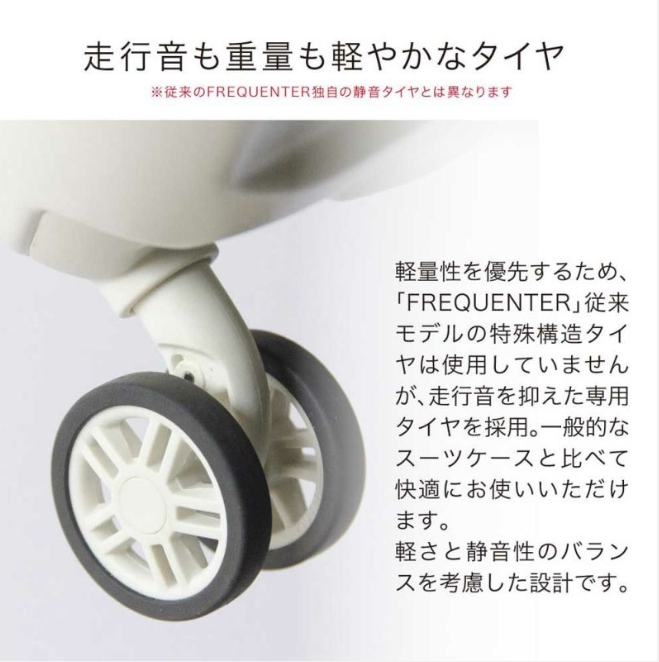 軽いスーツケースを探してこちらを購入。確かにすごく軽いけど、他のフリクエンターシリーズとはキャスターが劣り、超静音キャスターではないのが残念。シンプルな作りですぐ壊れそうな気がするので星3つ。