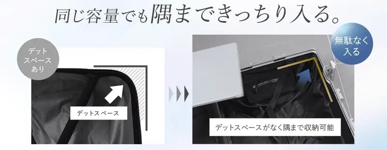 衣類などを隙間なくきっちり詰めたい方は、角が丸い一般的なスーツケースよりも、スクエアな形状のモデルを選ぶとデッドスペースが生まれにくくなるのでおすすめです。