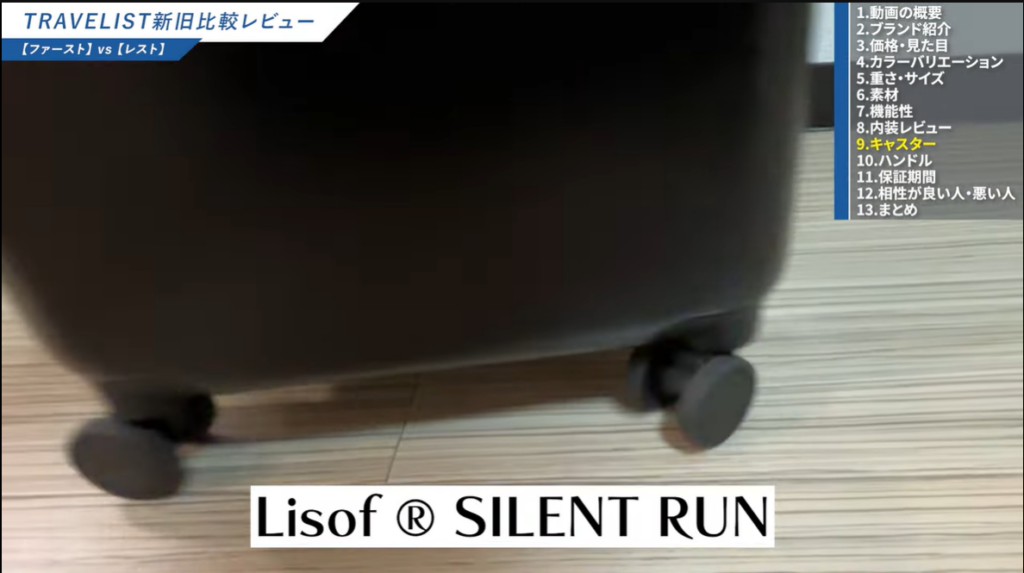 動画「【神静音】旅のストレス激減!キャスターが静かなスーツケース2選」では、実際に他社の静音性モデルと比較していますので、ぜひご覧ください。
